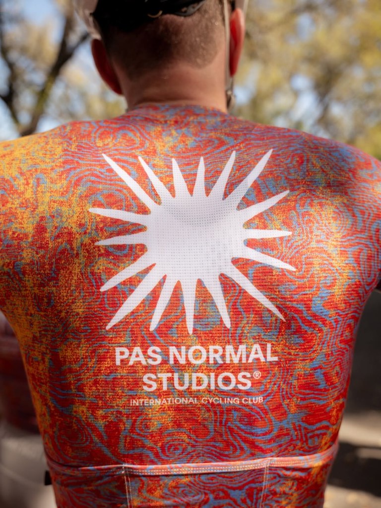 The gear itself leans into that balance. At a distance the palette reads warm and immediate, but up close the surface breaks into layered movement, almost like heat or topography shifting across the fabric. It mirrors the way light actually moves during those early Austin rides. The fit stays true to what Pas Normal Studios does best, aerodynamic without feeling aggressive, built for long efforts but worn casually within the group. It’s technical, but not over-explained. The kind of piece that performs without needing to announce it.