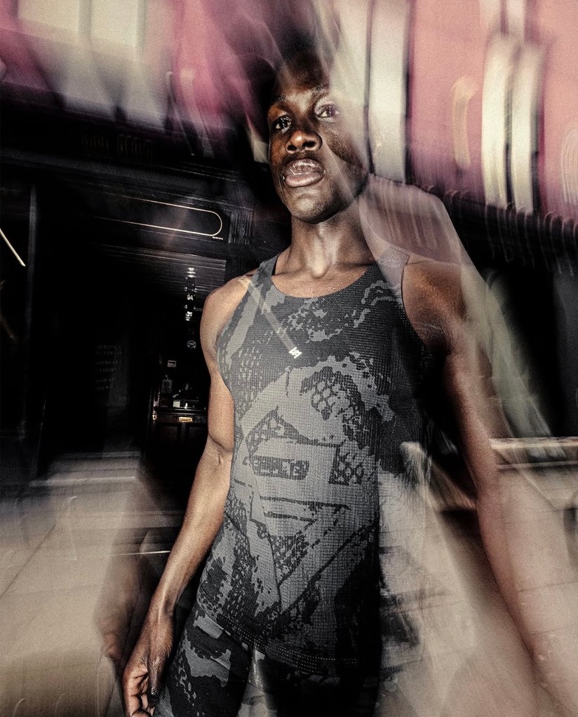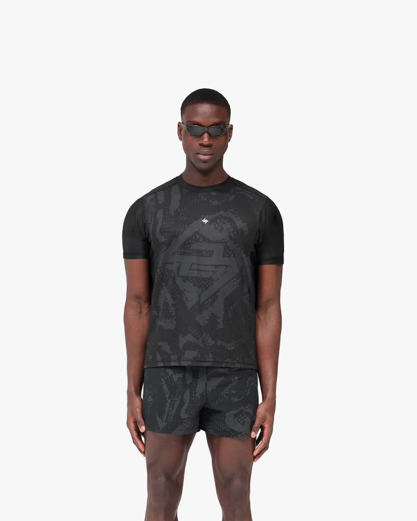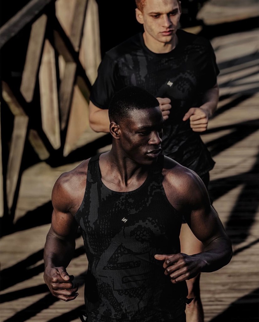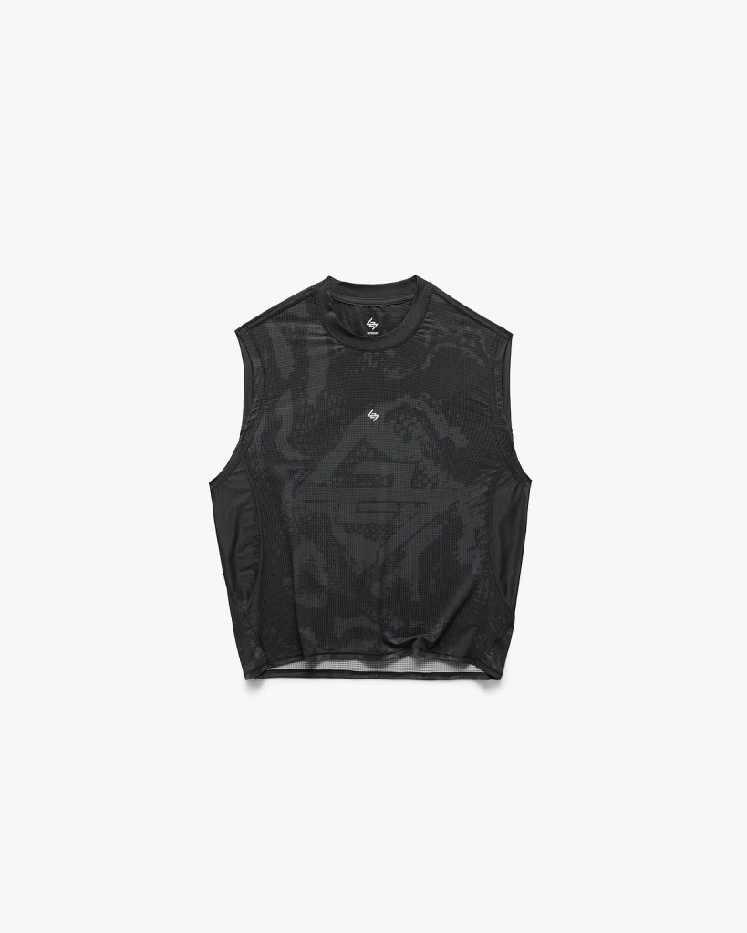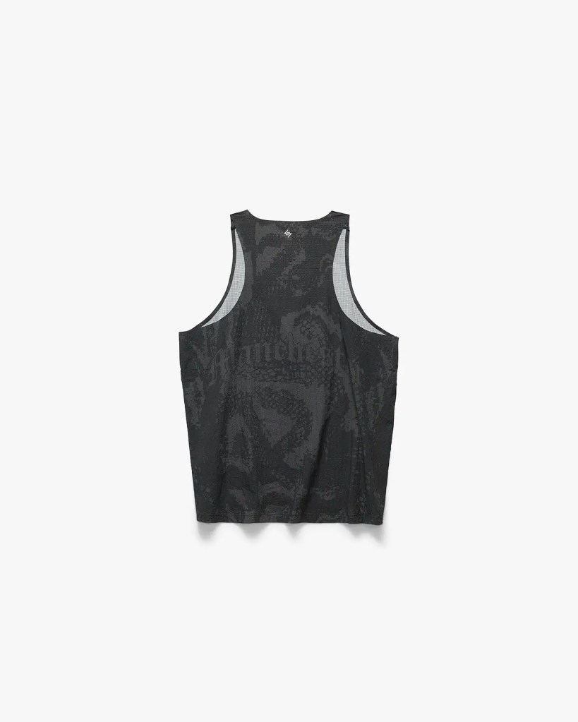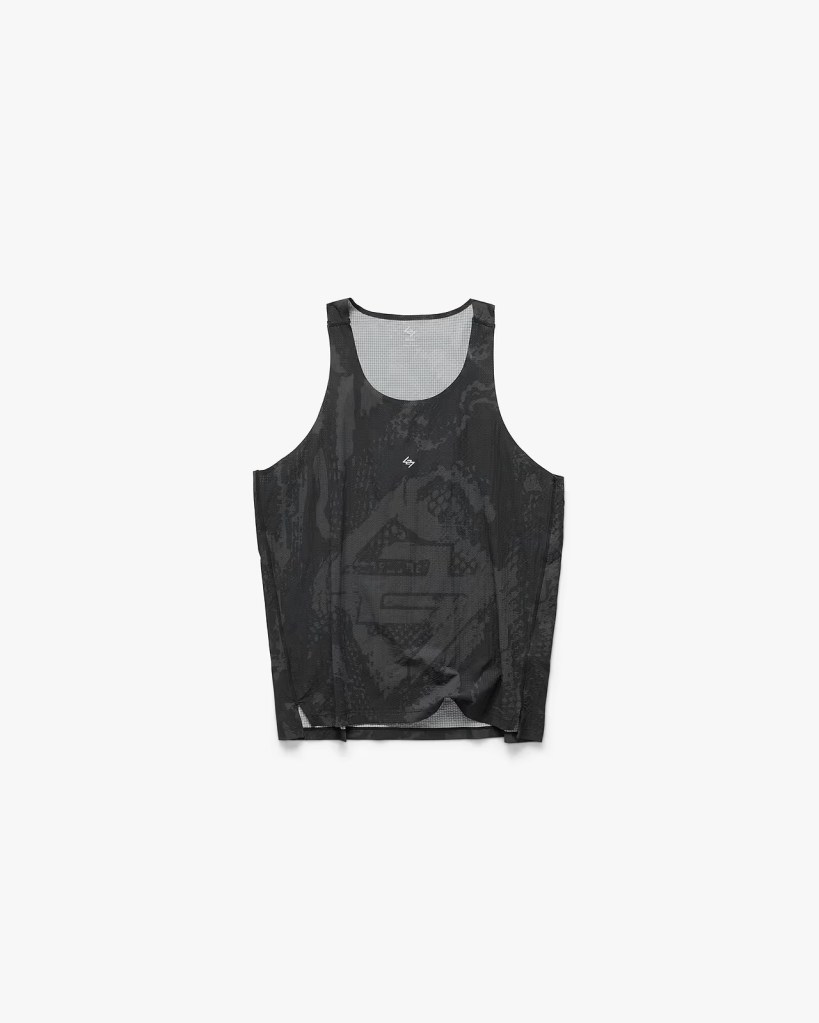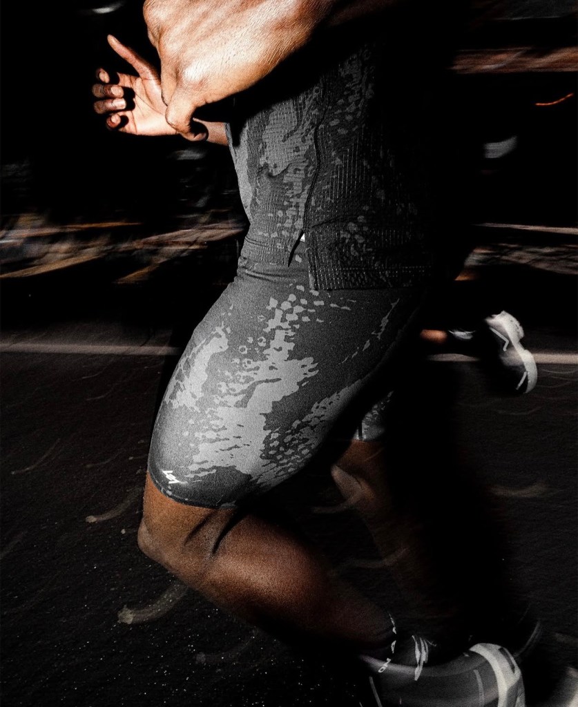 At the center is the race-ready combination of the singlet and half tights. The singlet is constructed from lightweight mesh with a racerback cut that allows full range through the shoulders. A mesh back panel increases airflow during higher effort, while bonded seams keep everything smooth and close to the body. The tonal printed finish keeps the surface controlled, adding texture without taking away from the overall simplicity.
