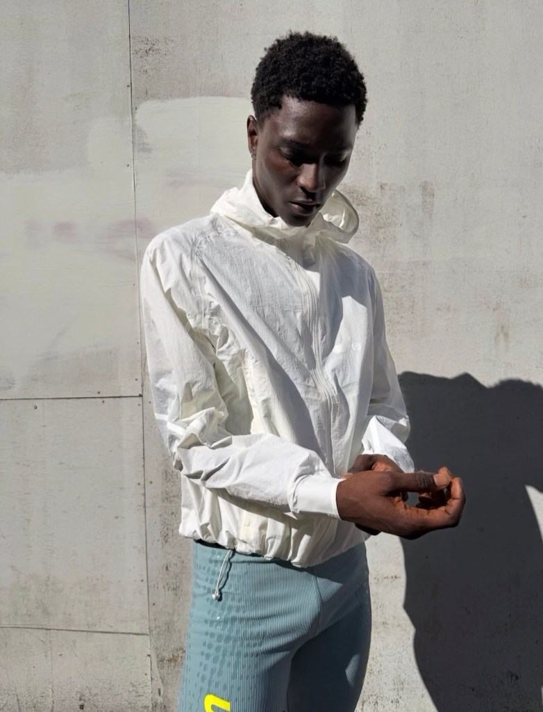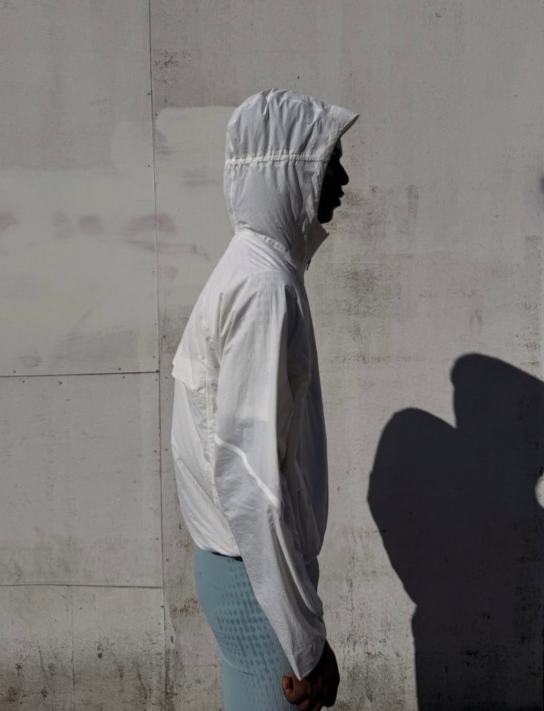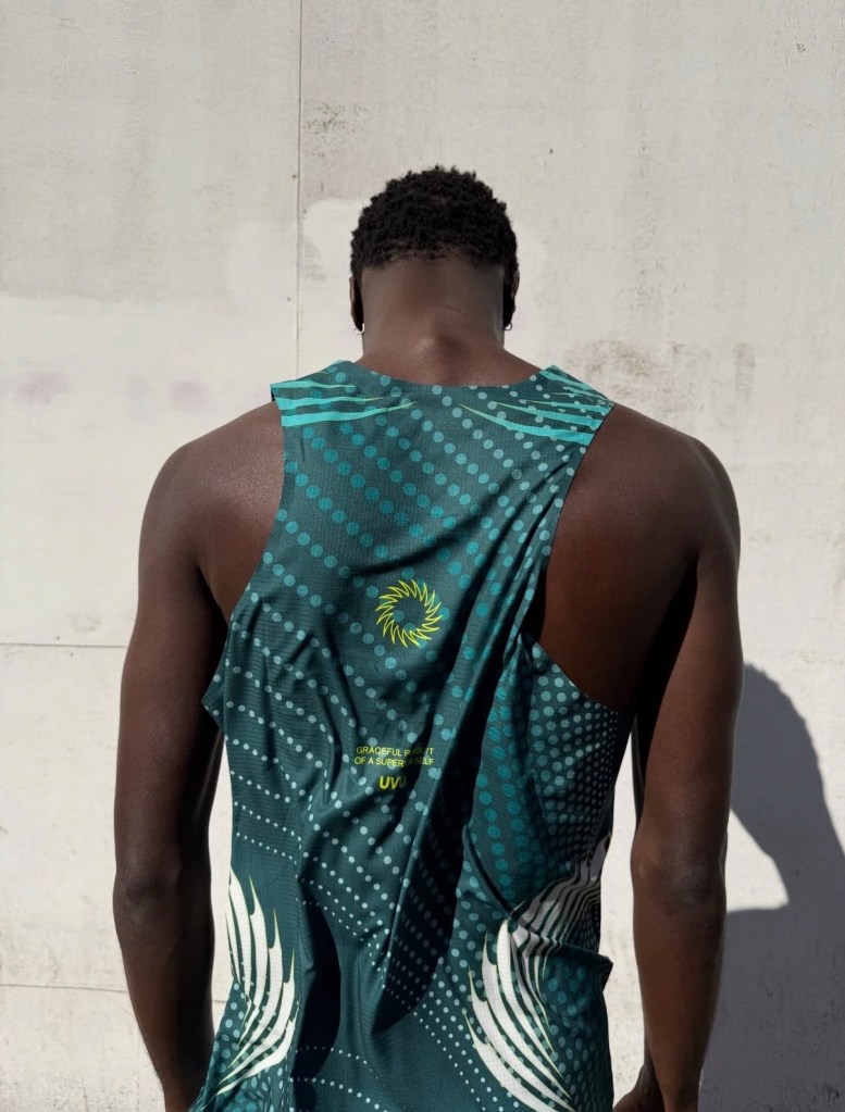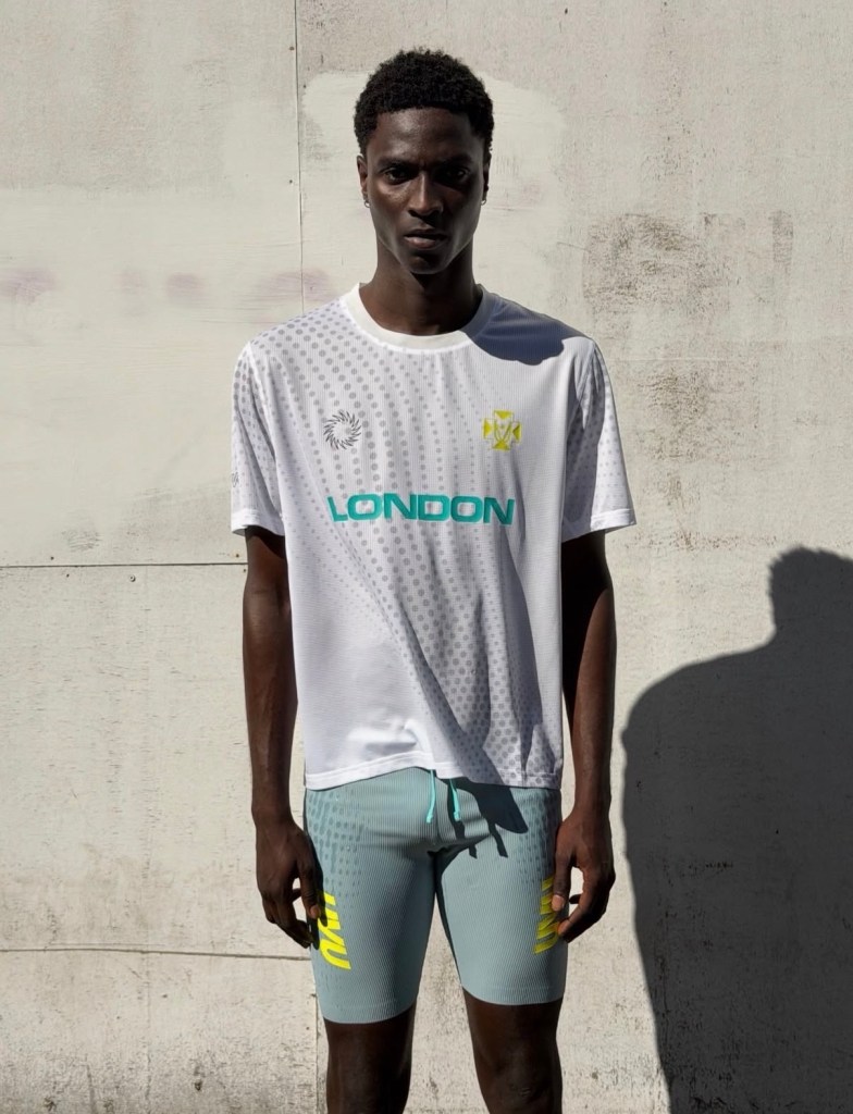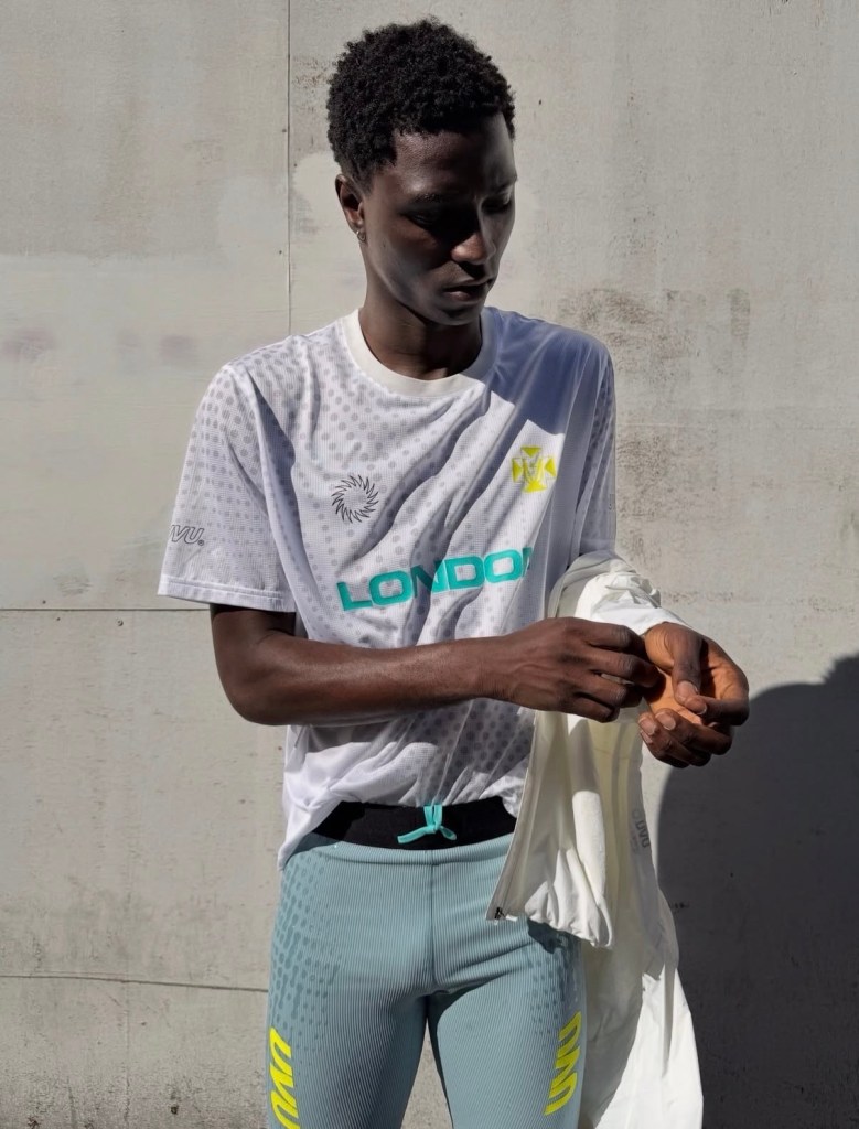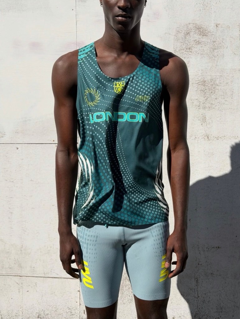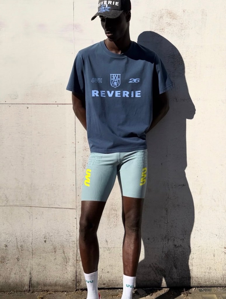 The collection is being made available through a temporary retail presence at Reverie, hosted at Flannels on Oxford Street during marathon weekend. The garments follow uvu’s core approach, with breathable race tops built from perforated, lightweight fabric featuring a dotted visual system and “London” placed front and center. These are paired with compressive half tights in a muted tone with high contrast branding, alongside a translucent outer shell designed to layer without adding weight.